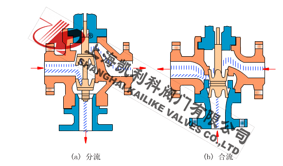 三通調節閥閥芯結構為圓筒型薄壁窗口形閥芯,采用閥芯側面導向與閥座內表面導向和上襯套導向,因此導向面積大,工作可靠。流體對閥芯作用方向都處于流開狀態,故閥工作性能穩定。三通調節閥有三通合流式調節閥(把兩種流體經三通閥混合成一種流體)和三通分流式調節閥(把一種流體經三通閥分成兩路流出)兩種形式。當公稱通徑DN≤80mm和壓差較小的場合時,分流閥可以采用同口徑的合流閥代替。流量特性有直線性、拋物線性兩種。三通調節閥它可以代替二臺同時使用的二通調節閥,起分流或合流作用及兩相調節配比作用。