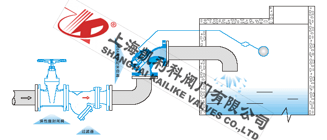 100A隔膜式定水位閥是一種隔膜式調節水箱和水塔液面高度的閥門。閥門由一特殊強化尼龍膜片將其分為上下兩個腔室,當液面達到設定位置時,浮球導閥關閉,上腔壓力大于下腔,閥門關閉,即停止供水.當液面下降超過預設位置,浮球導閥開啟,上腔壓力小于下腔壓力,閥門開啟.閥門向池內供水。